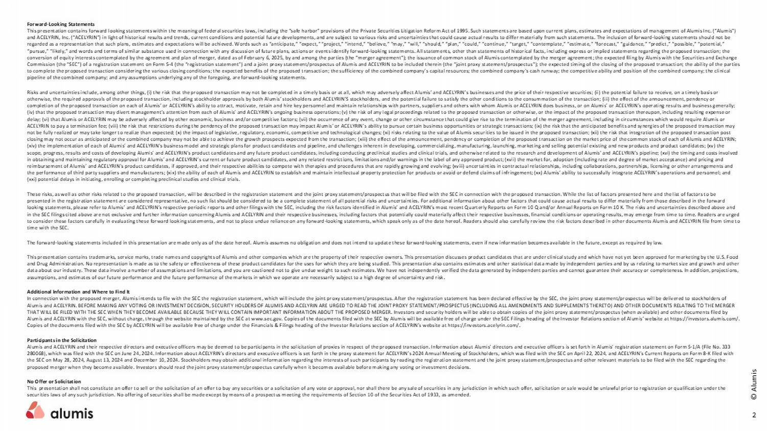 Risks and uncertainties include, among other things, (i) the risk that the proposed transaction may not be completed in a timely basis or at all, which may adversely affect Alumis’ and ACELYRIN’s businesses and the price of their respective securities; (ii) the potential failure to receive, on a timely basis or otherwise, the required approvals of the proposed transaction, including stockholder approvals by both Alumis’ stockholders and ACELYRIN’S stockholders, and the potential failure to satisfy the other conditions to the consummation of the transaction; (iii) the effect of the announcement, pendency or completion of the proposed transaction on each of Alumis’ or ACELYRIN’s ability to attract, motivate, retain and hire key personnel and maintain relationships with partners, suppliers and others with whom Alumis or ACELYRIN does business, or on Alumis’ or ACELYRIN’s operating results and business generally; (iv) that the proposed transaction may divert management’s attention from each of Alumis’ and ACELYRIN’s ongoing business operations; (v) the risk of any legal proceedings related to the proposed transaction or otherwise, or the impact of the proposed transaction thereupon, including resulting expense or delay; (vi) that Alumis or ACELYRIN may be adversely affected by other economic, business and/or competitive factors; (vii) the occurrence of any event, change or other circumstance that could give rise to the termination of the merger agreement, including in circumstances which would require Alumis or ACELYRIN to pay a termination fee; (viii) the risk that restrictions during the pendency of the proposed transaction may impact Alumis’ or ACELYRIN’s ability to pursue certain business opportunities or strategic transactions; (ix) the risk that the anticipated benefits and synergies of the proposed transaction may not be fully realized or may take longer to realize than expected; (x) the impact of legislative, regulatory, economic, competitive and technological changes; (xi) risks relating to the value of Alumis securities to be issued in the proposed transaction; (xii) the risk that integration of the proposed transaction post-closing may not occur as anticipated or the combined company may not be able to achieve the growth prospects expected from the transaction; (xiii) the effect of the announcement, pendency or completion of the proposed transaction on the market price of the common stock of each of Alumis and ACELYRIN; (xiv) the implementation of each of Alumis’ and ACELYRIN’s business model and strategic plans for product candidates and pipeline, and challenges inherent in developing, commercializing, manufacturing, launching, marketing and selling potential existing and new products and product candidates; (xv) the scope, progress, results and costs of developing Alumis’ and ACELYRIN’s product candidates and any future product candidates, including conducting preclinical studies and clinical trials, and otherwise related to the research and development of Alumis’ and ACELYRIN’s pipeline; (xvi) the timing and costs involved in obtaining and maintaining regulatory approval for Alumis’ and ACELYRIN’s current or future product candidates, and any related restrictions, limitations and/or warnings in the label of any approved product; (xvii) the market for, adoption (including rate and degree of market acceptance) and pricing and reimbursement of Alumis’ and ACELYRIN’s product candidates, if approved, and their respective abilities to compete with therapies and procedures that are rapidly growing and evolving; (xviii) uncertainties in contractual relationships, including collaborations, partnerships, licensing or other arrangements and the performance of third-party suppliers and manufacturers; (xix) the ability of each of Alumis and ACELYRIN to establish and maintain intellectual property protection for products or avoid or defend claims of infringement; (xx) Alumis’ ability to successfully integrate ACELYRIN’s operations and personnel; and (xxi) potential delays in initiating, enrolling or completing preclinical studies and clinical trials.