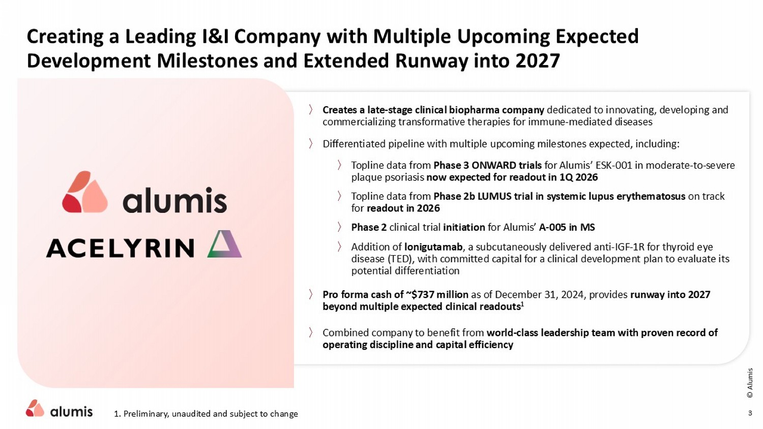 2 © Alumis Forward - Looking Statements This presentation contains forward looking statements within the meaning of federal securities laws, including the “safe harb or” provisions of the Private Securities Litigation Reform Act of 1995. Such statements are based upon current plans, estimates a nd expectations of management of Alumis Inc. (“Alumis”) and ACELYRIN, Inc. (“ACELYRIN”) in light of historical results and trends, current conditions and potential future developmen ts, and are subject to various risks and uncertainties that could cause actual results to differ materially from such statements. T he inclusion of forward - looking statements should not be regarded as a representation that such plans, estimates and expectations will be achieved. Words such as “anticipate,” “expec t,” “project,” “intend,” “believe,” “may,” “will,” “should,” “plan,” “could,” “continue,” “target,” “contemplate,” “estimate,” “f or ecast,” “guidance,” “predict,” “possible,” “potential,” “pursue,” “likely,” and words and terms of similar substance used in connection with any discussion of future plans, actions or events identify forward - looking statements. All statements, other than statements of historical facts, including express or impl ied statements regarding the proposed transaction; the conversion of equity interests contemplated by the agreement and plan of merger, dated as of February 6, 2025, by and among t he parties (the “merger agreement”); the issuance of common stock of Alumis contemplated by the merger agreement; the expected f ili ng by Alumis with the Securities and Exchange Commission (the “SEC”) of a registration statement on Form S - 4 (the “registration statement”) and a joint proxy statement/prospe ctus of Alumis and ACELYRIN to be included therein (the “joint proxy statement/prospectus”); the expected timing of the closi ng of the proposed transaction; the ability of the parties to complete the proposed transaction considering the various closing conditions; the expected benefits of the proposed transa cti on; the sufficiency of the combined company’s capital resources; the combined company’s cash runway; the competitive ability and position of the combined company; the clinical pipeline of the combined company; and any assumptions underlying any of the foregoing, are forward - looking statements. Risks and uncertainties include, among other things, (i) the risk that the proposed transaction may not be completed in a tim ely basis or at all, which may adversely affect Alumis’ and ACELYRIN’s businesses and the price of their respective securities; ( ii ) the potential failure to receive, on a timely basis or otherwise, the required approvals of the proposed transaction, including stockholder approvals by both Alumis’ stockholders a nd ACELYRIN’S stockholders, and the potential failure to satisfy the other conditions to the consummation of the transaction; (i ii) the effect of the announcement, pendency or completion of the proposed transaction on each of Alumis’ or ACELYRIN’s ability to attract, motivate, retain and hire key per son nel and maintain relationships with partners, suppliers and others with whom Alumis or ACELYRIN does business, or on Alumis’ or ACELYRIN’s operating results and business generally; (iv) that the proposed transaction may divert management’s attention from each of Alumis’ and ACELYRIN’s ongoing business ope rat ions; (v) the risk of any legal proceedings related to the proposed transaction or otherwise, or the impact of the proposed t ran saction thereupon, including resulting expense or delay; (vi) that Alumis or ACELYRIN may be adversely affected by other economic, business and/or competitive factors; (vii) t he occurrence of any event, change or other circumstance that could give rise to the termination of the merger agreement, includ ing in circumstances which would require Alumis or ACELYRIN to pay a termination fee; (viii) the risk that restrictions during the pendency of the proposed transaction may impa ct Alumis’ or ACELYRIN’s ability to pursue certain business opportunities or strategic transactions; (ix) the risk that the anti cip ated benefits and synergies of the proposed transaction may not be fully realized or may take longer to realize than expected; (x) the impact of legislative, regulatory, economic, compe tit ive and technological changes; (xi) risks relating to the value of Alumis securities to be issued in the proposed transaction ; ( xii) the risk that integration of the proposed transaction post closing may not occur as anticipated or the combined company may not be able to achieve the growth prospects expected from th e t ransaction; (xiii) the effect of the announcement, pendency or completion of the proposed transaction on the market price of the common stock of each of Alumis and ACELYRIN; (xiv) the implementation of each of Alumis’ and ACELYRIN’s business model and strategic plans for product candidates and pipe lin e, and challenges inherent in developing, commercializing, manufacturing, launching, marketing and selling potential existing an d new products and product candidates; (xv) the scope, progress, results and costs of developing Alumis’ and ACELYRIN’s product candidates and any future product candidates, in cluding conducting preclinical studies and clinical trials, and otherwise related to the research and development of Alumis’ and ACELYRIN’s pipeline; (xvi) the timing and costs involved in obtaining and maintaining regulatory approval for Alumis’ and ACELYRIN’s current or future product candidates, and any rel ate d restrictions, limitations and/or warnings in the label of any approved product; (xvii) the market for, adoption (including rat e and degree of market acceptance) and pricing and reimbursement of Alumis’ and ACELYRIN’s product candidates, if app