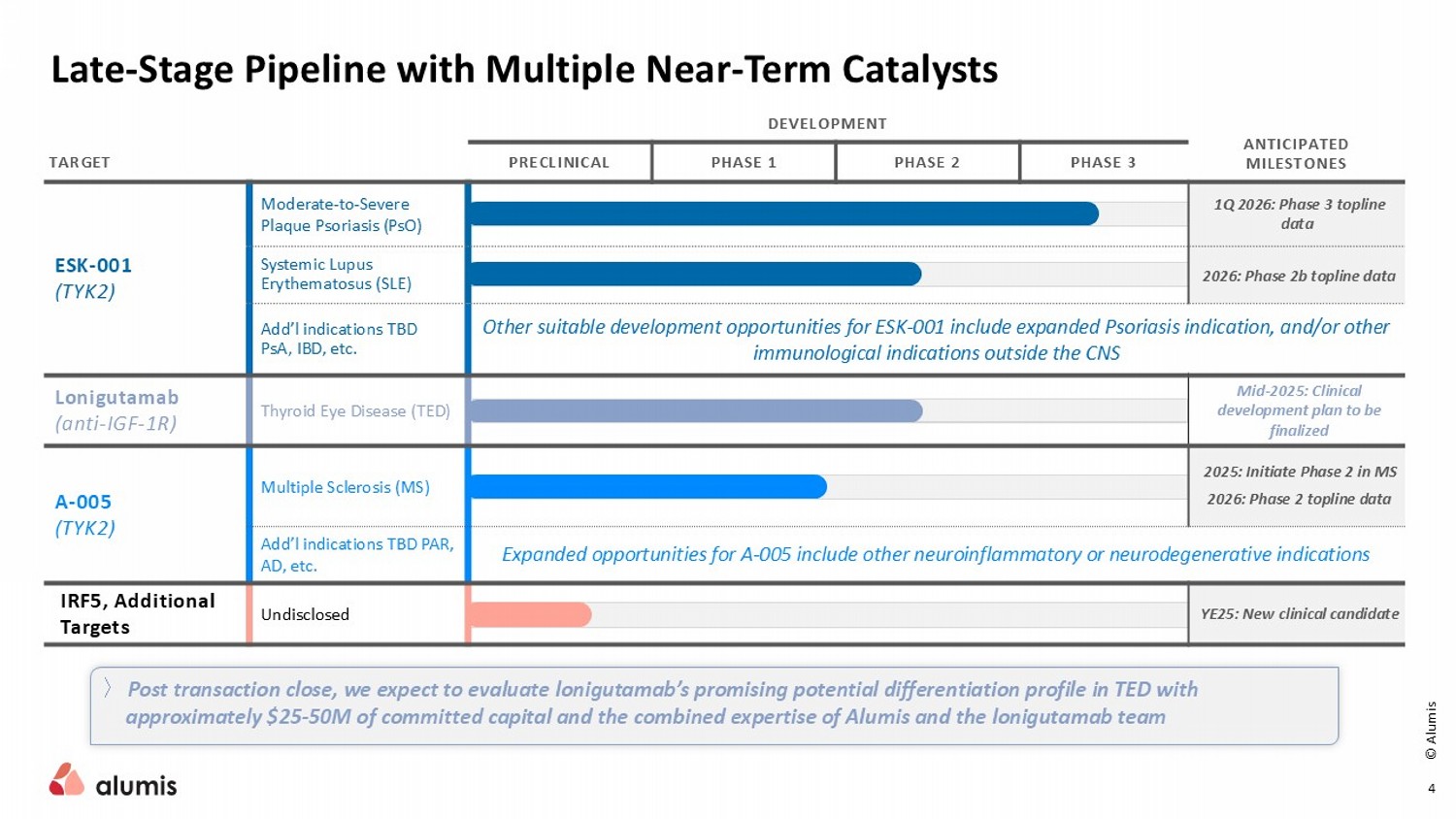1. Preliminary, unaudited and subject to change © Alumis 3 Creating a Leading I&I Company with Multiple Upcoming Expected Development Milestones and Extended Runway into 2027 〉 Creates a late - stage clinical biopharma company dedicated to innovating, developing and commercializing transformative therapies for immune - mediated diseases 〉 Differentiated pipeline with multiple upcoming milestones expected, including: 〉 Topline data from Phase 3 ONWARD trials for Alumis ’ ESK - 001 in moderate - to - severe plaque psoriasis now expected for readout in 1Q 2026 〉 Topline data from Phase 2b LUMUS trial in systemic lupus erythematosus on track for readout in 2026 〉 Phase 2 clinical trial initiation for Alumis ’ A - 005 in MS 〉 Addition of lonigutamab , a subcutaneously delivered anti - IGF - 1R for thyroid eye disease (TED), with committed capital for a clinical development plan to evaluate its potential differentiation 〉 Pro forma cash of ~$737 million as of December 31, 2024, provides runway into 2027 beyond multiple expected clinical readouts 1 〉 Combined company to benefit from world - class leadership team with proven record of operating discipline and capital efficiency