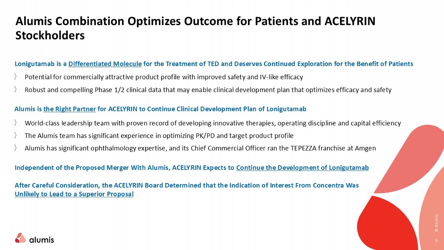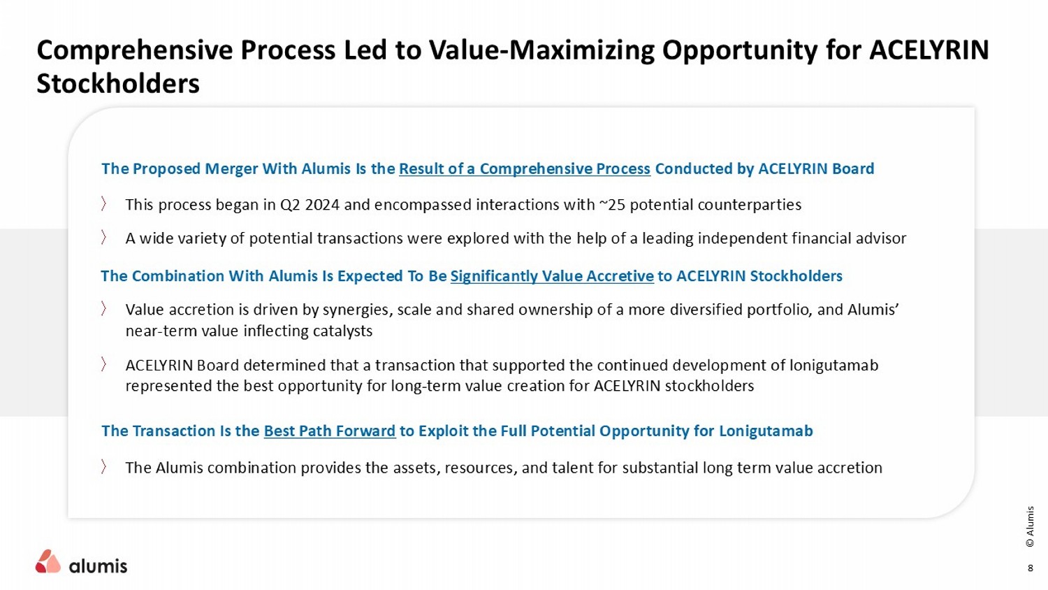 © Alumis 7 We Believe That the Transaction Has Potential for Substantial Value Creation for ACELYRIN Stockholders Notes: 1. In connection with its consideration of the merger, the Board of ACELYRIN considered, among other things, a financial present ati on from Guggenheim Securities, LLC (“Guggenheim Securities”) dated as of February 6, 2025 (the “February 6, 2025 Presentation”). That presentation contained, among other things, a summar y o f a discounted cash flow analysis of ACELYRIN on a standalone basis that was performed by Guggenheim Securities based on financial projections provided by ACELYRIN (the “ACELYRIN Standalo ne DCF Analysis“) and a summary of a discounted cash flow analysis of ACELYRIN and Alumis on a pro forma basis giving effect to the merger and certain transaction - related synergies that was performed by Guggenheim Securities based on financial projections provided by ACELYRIN (the “Pro Forma DCF Analysis”). The range of implied per share equity values of the common s toc k of ACELYRIN resulting from the ACELYRIN Standalone DCF Analysis is set forth above the caption “ACELYRIN Standalone” and the range of the implied equity values for the Alumis commo n s tock to be received by the ACELYRIN stockholders in the merger per share of ACELYRIN common stock is set forth above the caption “Pro Forma Value per ACELYRIN share”. Annex I to the Ma rch 6 th , 2025 ACELYRIN 8 - K contains a summary of certain assumptions made, procedures followed, matters considered and limitations, qualifications and other conditions relating to th e A CELYRIN Standalone DCF Analysis and the Pro Forma DCF Analysis. The joint proxy statement / prospectus that will be filed with the SEC by Alumis and ACELYRIN in connection with th e p roposed transaction will contain a detailed summary of the financial analyses performed by Guggenheim Securities. 2. Guggenheim Securities used a discount rate range of 13.25% to 15.25% for the ACELYRIN Standalone DCF Analysis, based on its e sti mate of ACELYRIN’s weighted average cost of capital. 3. Guggenheim Securities used a discount rate range of 12.00% to 14.00% for the Pro Forma DCF Analysis, based on its estimate of Al umis’ weighted average cost of capital after giving pro forma effect to the merger. 4. March 6 th , 2025 ACELYRIN 8 - K – Value creation analysis pictured on page 6. ACELYRIN’s Value Accretion Analysis as of February 6, 2025 4 〉 Opportunity to participate in significant upside (45% ownership in combined company) from a vast set of value inflecting near - term catalysts ‒ ESK - 001 pivotal PsO data in 1Q26 ‒ ESK - 001 Phase 2b SLE data in 2026 ‒ A - 005 Phase 2 MS data in 2026 ‒ Future lonigutamab catalysts 〉 Additional benefits from shared ownership of a large, late - stage and diversified portfolio , scale and synergies Combination with Alumis is estimated to be ~41% - 48% value Accretive to ACELYRIN Stockholders Source: ACELYRIN 8 - K Press Release on March 6 th , 2025