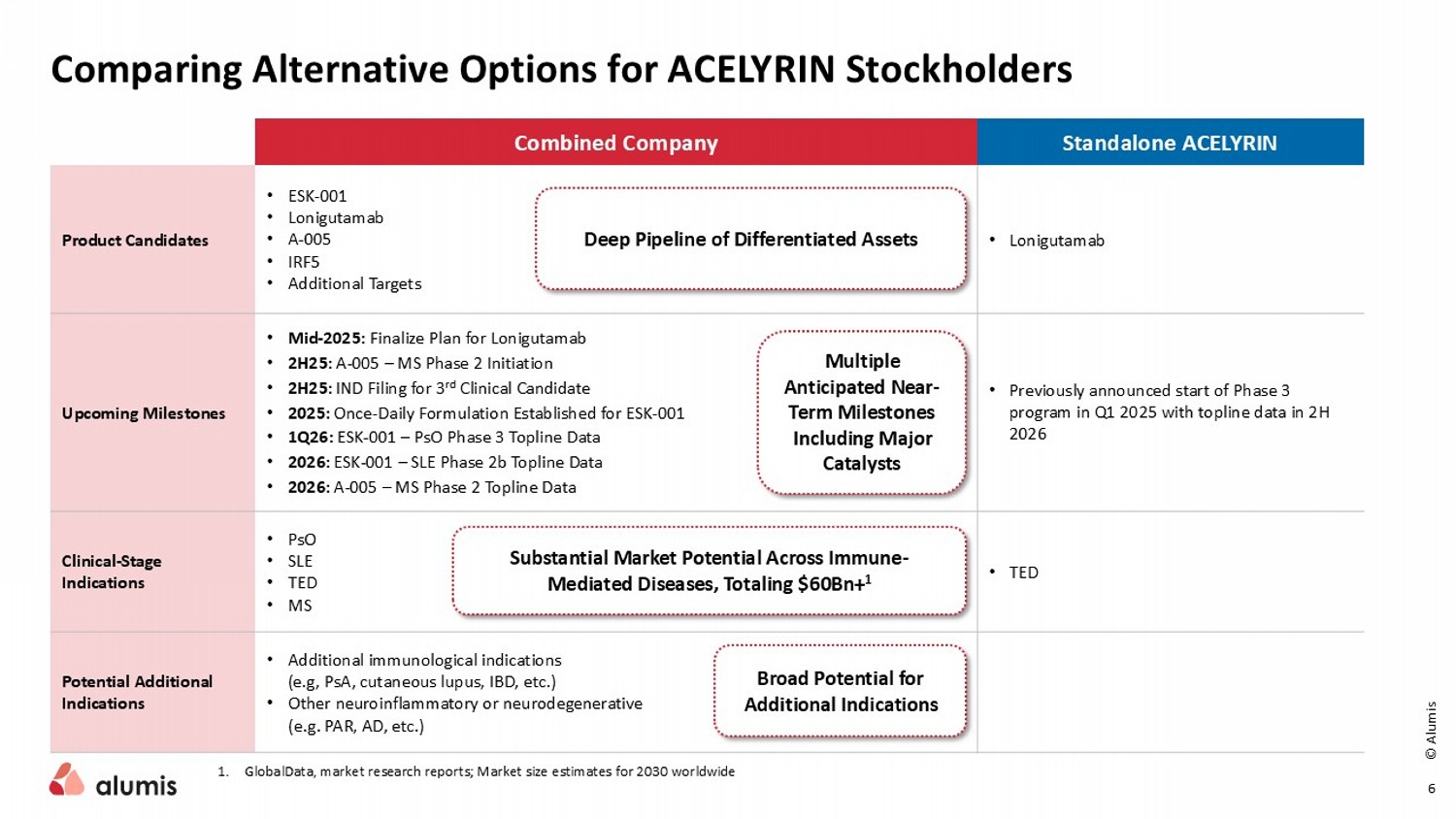 Alumis Combination Optimizes Outcome for Patients and ACELYRIN Stockholders 5 © Alumis Lonigutamab is a Differentiated Molecule for the Treatment of TED and Deserves Continued Exploration for the Benefit of Patients 〉 Potential for commercially attractive product profile with improved safety and IV - like efficacy 〉 Robust and compelling Phase 1/2 clinical data that may enable clinical development plan that optimizes efficacy and safety Alumis is the Right Partner for ACELYRIN to Continue Clinical Development Plan of Lonigutamab 〉 World - class leadership team with proven record of developing innovative therapies, operating discipline and capital efficiency 〉 The Alumis team has significant experience in optimizing PK/PD and target product profile 〉 Alumis has significant ophthalmology expertise, and its Chief Commercial Officer ran the TEPEZZA franchise at Amgen Independent of the Proposed Merger With Alumis, ACELYRIN Expects to Continue the Development of Lonigutamab After Careful Consideration, the ACELYRIN Board Determined that the Indication of Interest From Concentra Was Unlikely to Lead to a Superior Proposal
