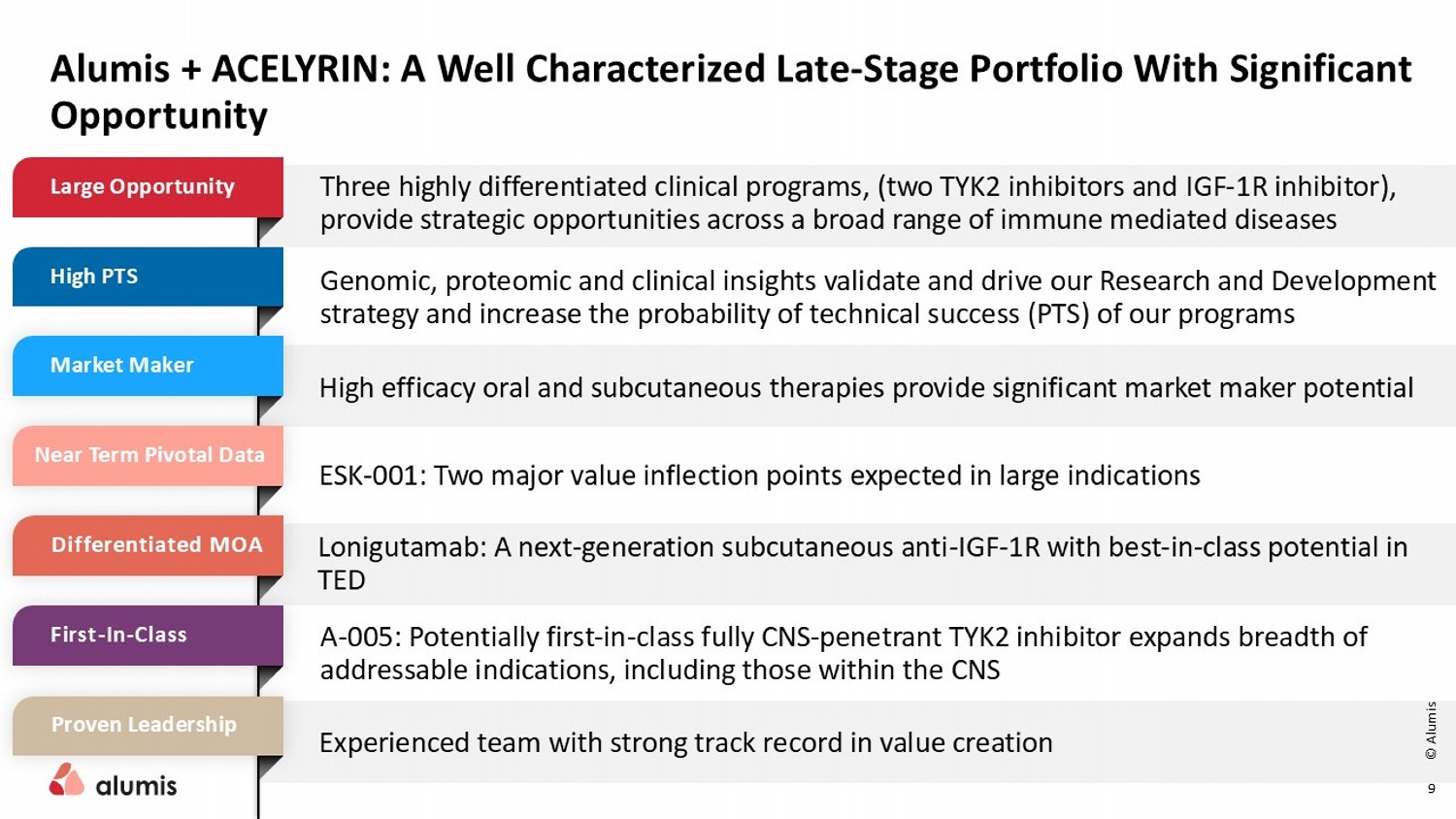 8 Comprehensive Process Led to Value - Maximizing Opportunity for ACELYRIN Stockholders © Alumis T he Proposed M erger With Alumis Is the R esult of a Comprehensive P rocess C onducted by ACELYRIN Board 〉 This process began in Q2 2024 and encompassed interactions with ~25 potential counterparties 〉 A wide variety of potential transactions were explored with the help of a leading independent financial advisor The Combination With Alumis Is Expected To Be Significantly Value Accretive to ACELYRIN Stockholders 〉 Value accretion is driven by synergies, scale and shared ownership of a more diversified portfolio, and Alumis’ near - term value inflecting catalysts 〉 ACELYRIN Board determined that a transaction that supported the continued development of lonigutamab represented the best opportunity for long - term value creation for ACELYRIN stockholders The Transaction Is the Best Path Forward to Exploit the Full Potential Opportunity for Lonigutamab 〉 The Alumis combination provides the assets, resources, and talent for substantial long term value accretion