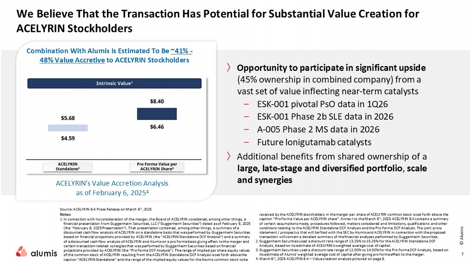 © Alumis 6 Comparing Alternative Options for ACELYRIN Stockholders Standalone ACELYRIN Combined Company • Lonigutamab • ESK - 001 • Lonigutamab • A - 005 • IRF5 • Additional Targets Product Candidates • Previously announced start of Phase 3 program in Q1 2025 with topline data in 2H 2026 • Mid - 2025: Finalize Plan for Lonigutamab • 2H25: A - 005 – MS Phase 2 Initiation • 2H25: IND Filing for 3 rd Clinical Candidate • 2025: Once - Daily Formulation Established for ESK - 001 • 1Q26: ESK - 001 – PsO Phase 3 Topline Data • 2026: ESK - 001 – SLE Phase 2b Topline Data • 2026: A - 005 – MS Phase 2 Topline Data Upcoming Milestones • TED • PsO • SLE • TED • MS Clinical - Stage Indications • Additional immunological indications ( e.g , PsA, cutaneous lupus, IBD, etc.) • Other neuroinflammatory or neurodegenerative indications (e.g. PAR, AD, etc.) Potential Additional Indications Deep Pipeline of Differentiated Assets 1. GlobalData , market research reports; Market size estimates for 2030 worldwide Multiple Anticipated Near - Term Milestones Including Major Catalysts Substantial Market Potential Across Immune - Mediated Diseases, Totaling $ 60Bn+ 1 Broad Potential for Additional Indications